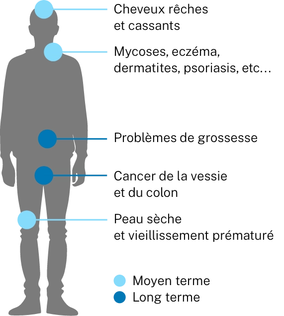 Plusieurs études ont révélé un lien entre l’exposition prolongée à des concentrations élevées de sous-produits de la chloration et une incidence accrue de cancer. Les concentrations élevées de THM (trihalométhanes, sous-produits de la chloration) peuvent également avoir un effet sur la grossesse.